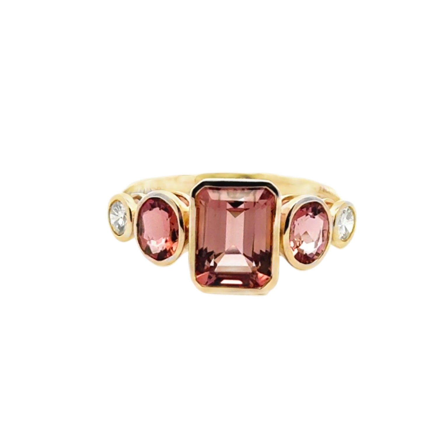 Der Ring Celina Rose vereint feminine Eleganz mit farbiger Strahlkraft. Im Mittelpunkt erstrahlt ein rechteckiger rosa Turmalin (ca. 9 x 7 mm), flankiert von zwei ovalen Turmalinen, die seine warme Farbintensität betonen. Ergänzt wird die Komposition durch funkelnde Brillanten (0,20 ct TW/VS1), die das Licht einfangen und dem Design luxuriöse Raffinesse verleihen.